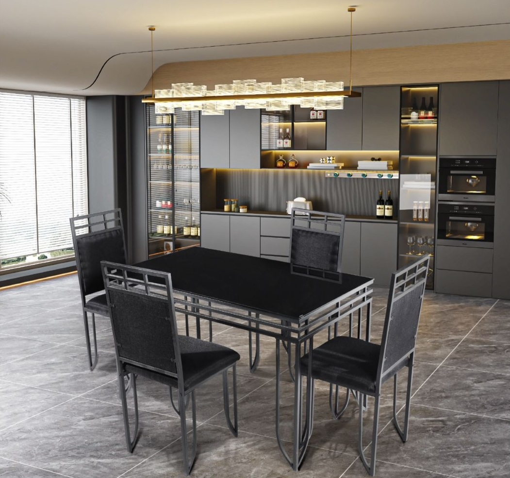 Transform your dining experience with this sleek and stylish 5-piece dining set, perfect for modern homes. The set features a sturdy rectangular table with a smooth black surface, complemented by four matching chairs designed with elegant, high-back frames and plush upholstered seats for maximum comfort. The contemporary design, marked by clean geometric lines and a durable metal construction, makes it an ideal centerpiece for kitchens or dining areas seeking a sophisticated touch. Spacious and practical, this dining set is perfect for both intimate family meals and entertaining guests. The set’s neutral black finish blends seamlessly with a variety of décor styles, providing both function and elegance to any living space. This 4 Chair Glass Dining Table is perfect for any kitchen or dining room. It features a black linen cushion and a black metal frame for a modern, stylish look,this 4 Chair Glass Dining Table is perfect for any home. Set against a backdrop of stylish cabinetry and ambient lighting, this dining set seamlessly enhances any modern kitchen or dining room, blending practicality with visual appeal. The durable construction and easy-to-clean surfaces make it a smart choice for busy households seeking lasting quality. With its versatile design, this Dining Table and Chair set provides a spacious focal point for entertaining guests or enjoying family dinners, redefining contemporary dining with refined sophistication and functional beauty.